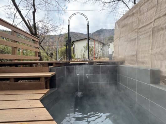 お庭で遊べる子供用プールを用意しました。隣に温泉の足湯がありますので、温泉を足して温度調節が可能。夏季はもちろんそれ以外のの季節でも温泉プールとして利用出来ます。